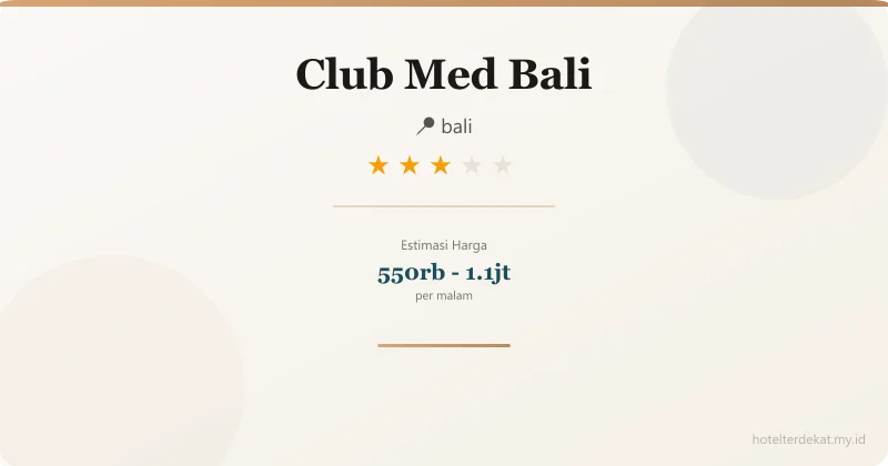 Club Med Bali adalah hotel bintang 3 yang berlokasi di Bali. Dengan harga mulai dari Rp 500K - Rp 800K per malam, hotel ini menawarkan akomodasi berkualitas dengan berbagai fasilitas modern.
