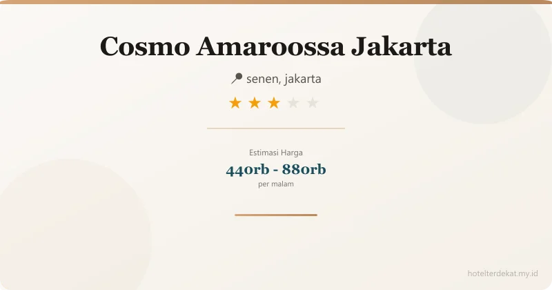 Cosmo Amaroossa Jakarta adalah smart hotel yang lokasinya strategic di area Senen! Dekat Stasiun Senen, dekat pusat kota, dan harganya ramah kantong. Perfect buat travelers yang value convenience dan accessibility!