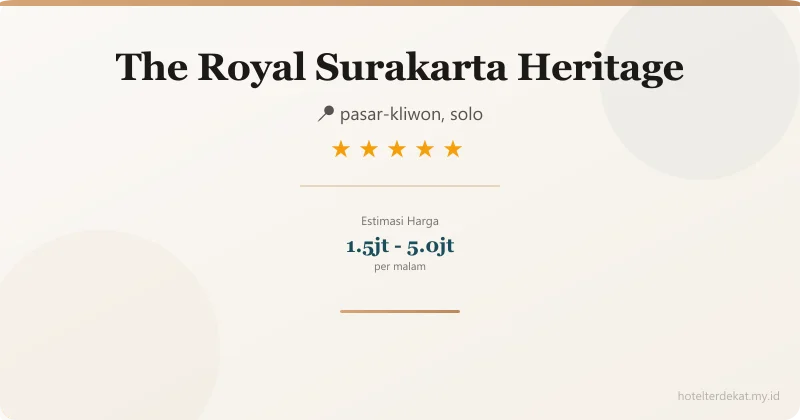 The Royal Surakarta Heritage Solo (MGallery Collection) bukan sekadar hotel, tapi sebuah galeri seni. Terletak di kawasan bersejarah Gladag, gedung ini dipenuhi dengan motif batik, wayang, dan topeng, menciptakan suasana Jawa yang mistis namun elegan.